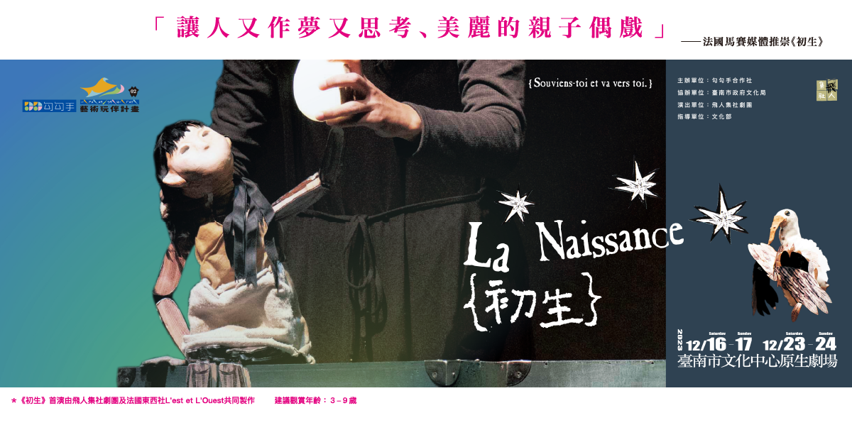 ● 勾勾手藝術玩伴計畫《初生La Naissance》親子劇12/23(六)15:00場次票券1組(1組2張)共5個名額 ● 勾勾手藝術玩伴計畫《初生La Naissance》親子劇12/24(日)15:00場次票券1組(1組2張)共5個名額 |