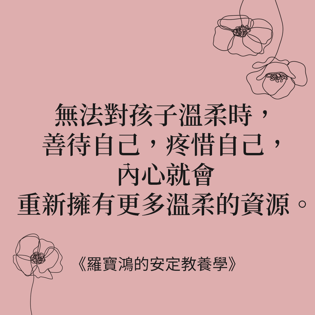 在我新書裡面有說:「無法對孩子溫柔,是因為我們內心的溫柔用光了。善待自己,欣賞自己,疼惜自己,內心就會有更多溫柔的資源。」