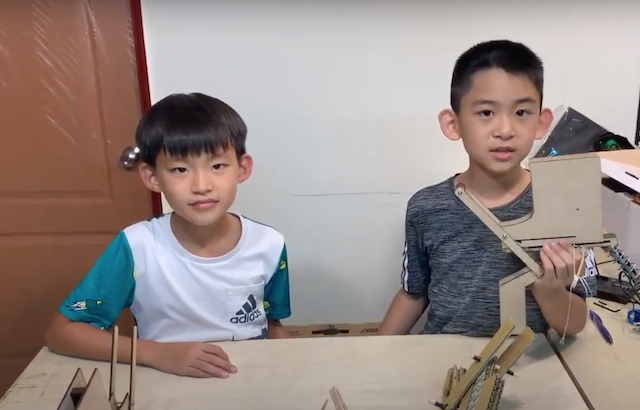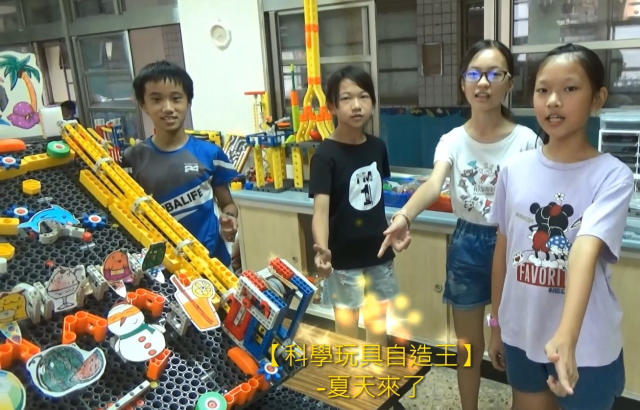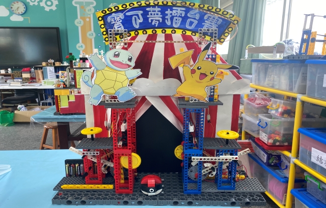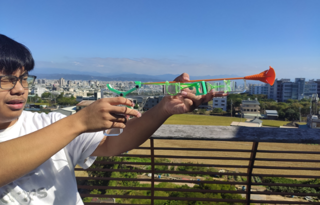 利用橡皮筋的彈力結合凸輪結構做出彈射裝置發射彈珠。使用機關社裡的積木創作機關,能夠反覆使用的零件也符合環保概念。