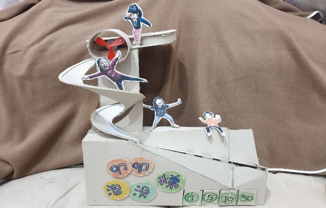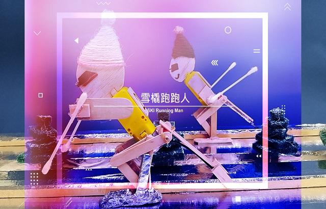 ”雪橇跑跑人”,屬一競賽型的科技遊戲。是以兩個TT減速馬達作為發電機與電動機,透過旋轉發電機馬達產生電流,利用軌道上鋁箔導電的特性,跑跑人會在軌道上滑雪杖前進。