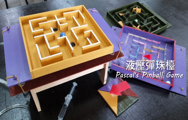 ”液壓彈珠檯”,屬一合作型的科技遊戲。透過針筒的升降讓彈珠檯產生高低落差! 透過針筒壓把的推拉產生升降,具體了解帕斯卡原理與液壓機械運作的機制。