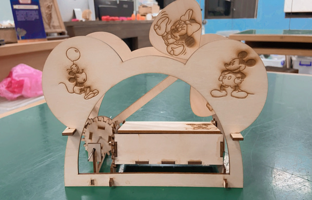 模仿烏克蘭Ugears的機動名片盒做出來的作品,他的機械理念雖然與原品相似,但是每一個零件都是我們使用Inkscape畫出來的。在盒子開啟前會是米奇,開啟後則是米妮。