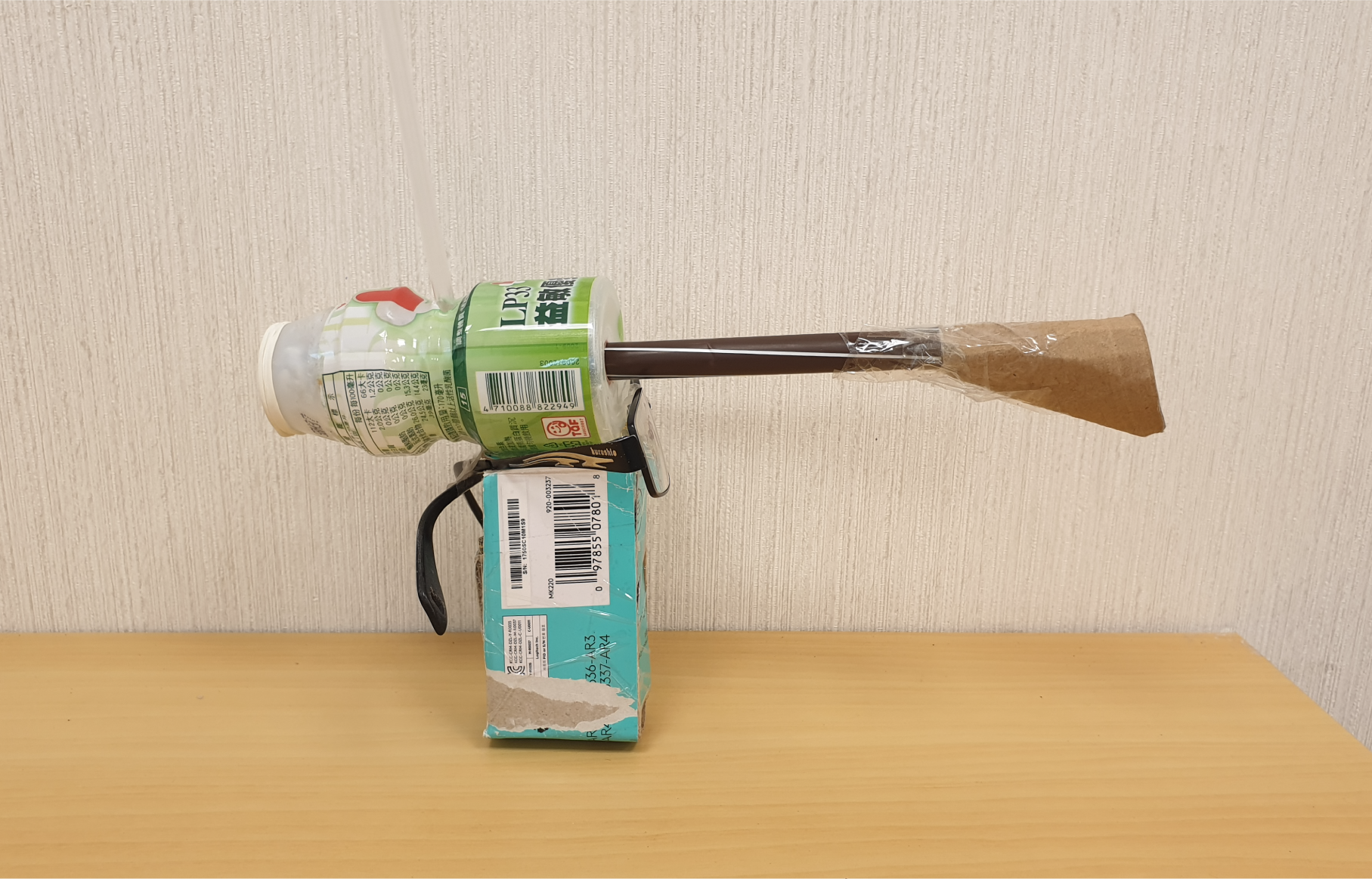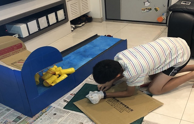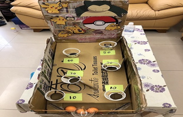 運用廢紙箱,重新組裝成一台大型投籃機。再用紙杯當籃框,在旁邊也註明上計分,選用乒乓球跟彈珠當作投籃的球,再用寶特瓶的瓶蓋當作發射器。