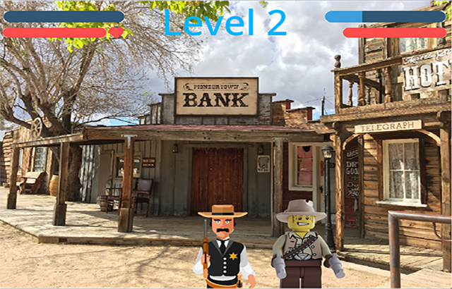 「快槍警長」,遊戲畫面採用Scratch開發,同時結合micro:Bit開發板,並自製左輪手槍與計步綁帶,達到體感互動目的,讓玩家與畫面警長一起打擊犯罪。