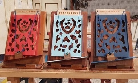 設計可讓小孩訓練手的平衡和腦部的運動, 正面的圖案使用雷射切割,切出摟空的部分,讓彈珠可以掉入, 而背板和底板則是使用學校不要的課桌面板回收利用。