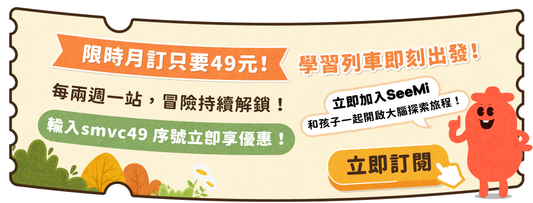 每兩週一站,冒險持續解鎖!立即加入SeeMi,和孩子一起開啟大腦探索旅程,還有月訂獨家優惠!輸入【smvc49】只要 $49 (原價399)