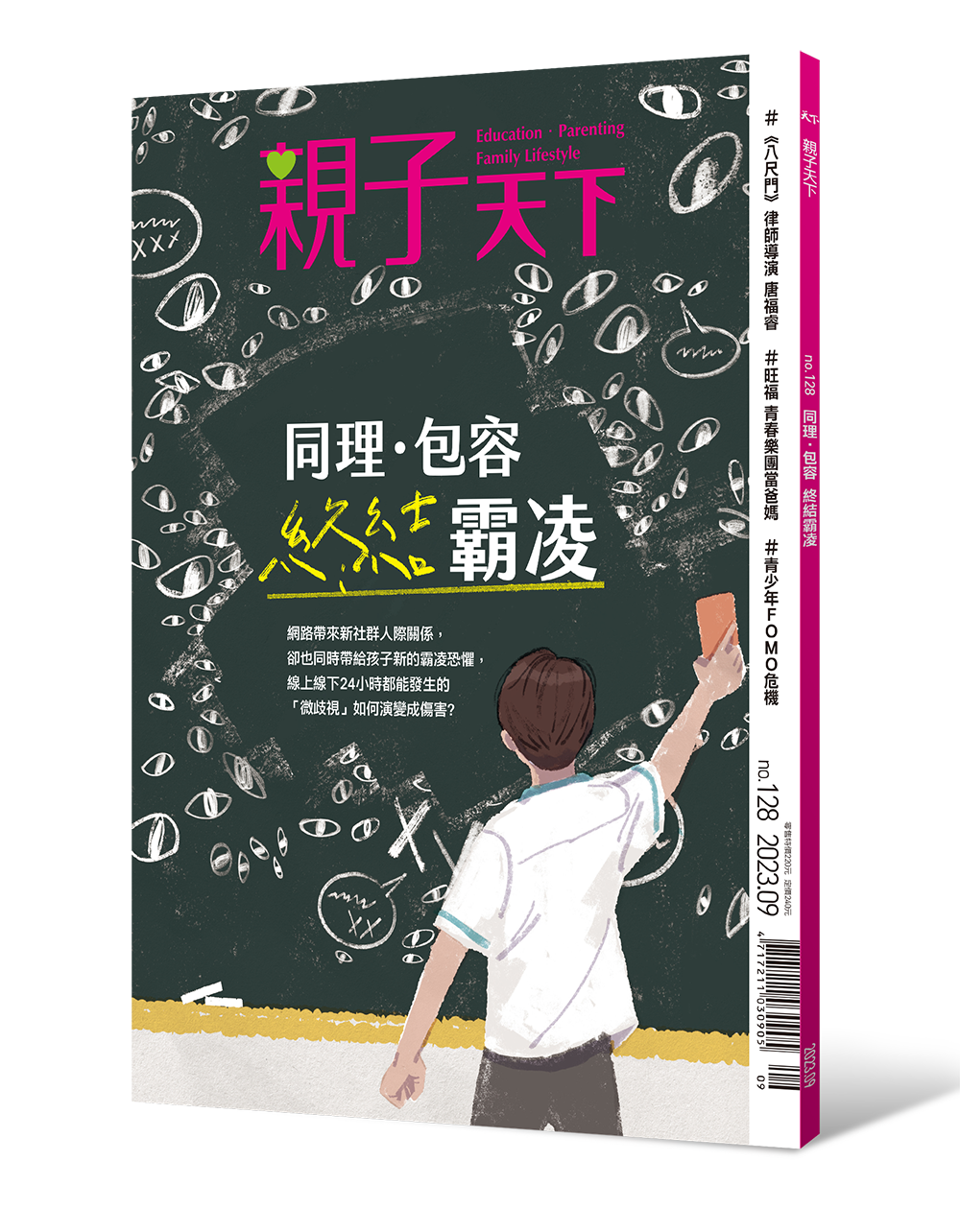 親子天下季刊9月號的封面故事「同理.包容 終結霸凌」,雜揉法律、心理等多元觀點,談生活中「微歧視」如何演變成霸凌,及網路與兒少生活密不可分後,為何會加劇霸凌嚴重性?透過清晰圖表與專家、素人的經驗談,呈現當前霸凌樣貌。最後提出5大通往友善校園的解方。