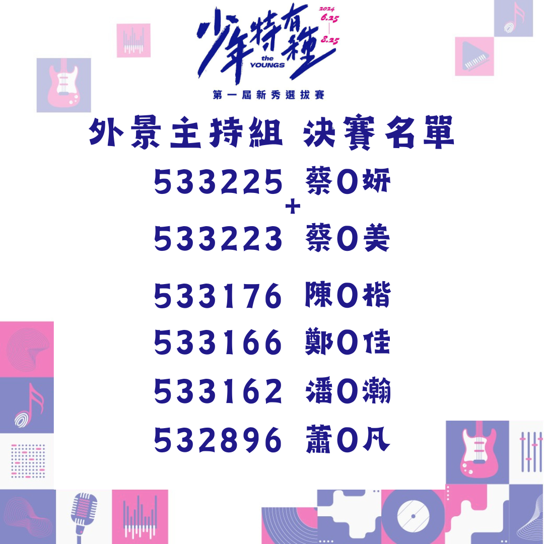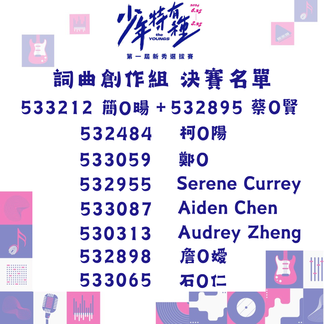 外景Youtuber現場報到後,領取指定手機(vivo V30)與內建剪輯軟體,限時兩小時拍攝採訪指定主題,影片(長度30秒),繳交後於舞台播放,評審現場評分。 詞曲創作 現場報到後抽籤上台序號,表演創作歌曲,表演時間限時3分鐘。 |